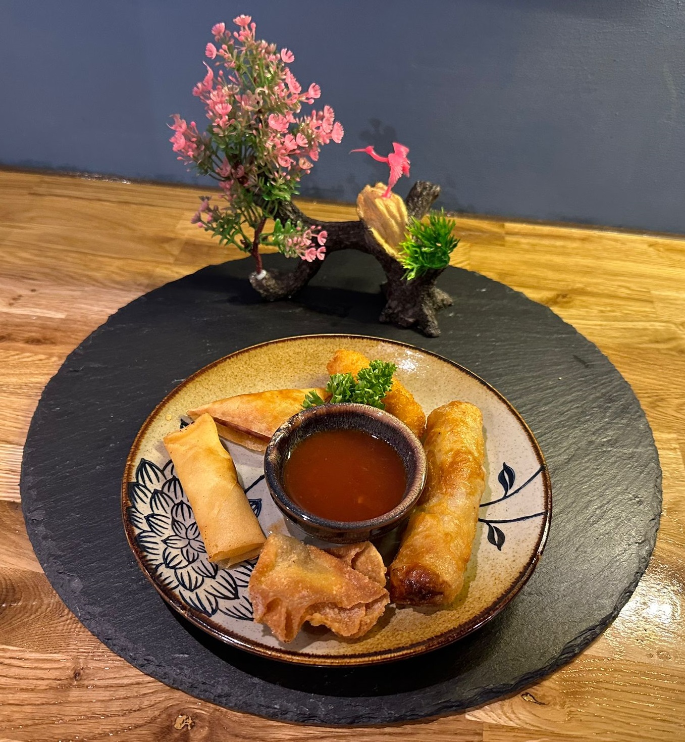 Mit Sake verfeinertes Hackfleisch - Schalotten und junge Möhren werden in ein dünnes Teigbett gerollt und goldbraun frittiert