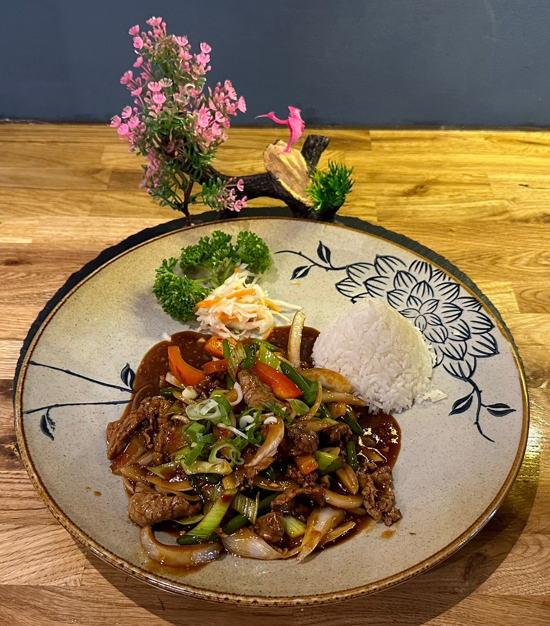 (serviert auf der heißen Gussplatte) Einmal Schlaraffenland hin und zurück: Enten-, Rind-, Hühner- und Schweinefleisch erwarten Sie. Garnelen dürfen natürlich auch nicht fehlen. Dazu kommen noch Pilze, Bambus, Knoblauch — alles in Butter gebraten. Ein sag