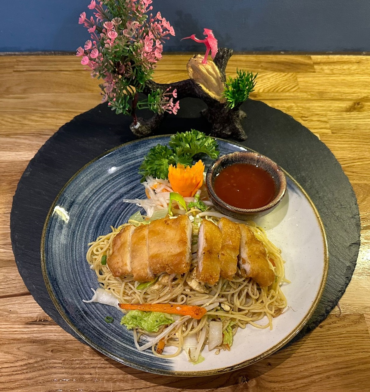 Geflügelhochzeit auf Gemüsefeld: bestehend aus knusprigem Enten- & Hühnerbrustfilet. Serviert mit einer milden-exotischen früchten Sauce